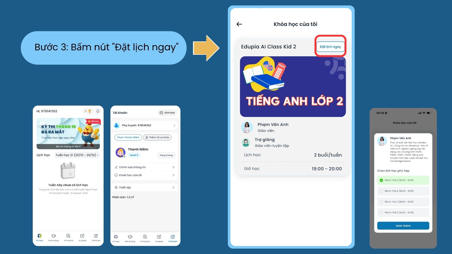 Bước 3: Chọn ngày học và khung giờ học, sau đó bấm "Đặt lịch học". Cuối cùng bấm "Đồng ý" để lưu lại